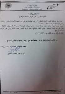 تعلن وحدة إدارة المشروعات جامعة سوهاج عن فتح باب التقدم لجوائز الجامعة للعام 2021و على الراغبين الاستفسار او التقديم يرجى الاضطلاع على القواعد العامة و تحميل نماذج التقدم المدرجة على الموقع .